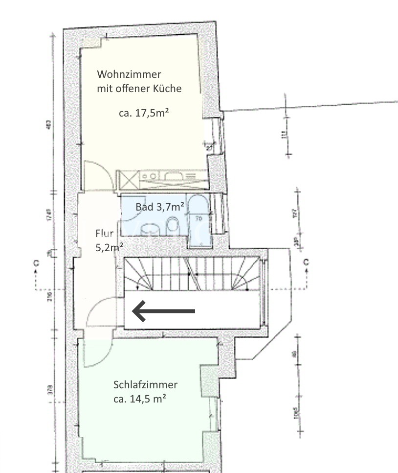 Die Wohnung ist schön geschnitten. Gleich vorn am Eingang links befindet sich das Schlafzimmer von fast 15m² Größe. Nach rechts geht das Wohnzimmer mit offener Küche, ausgestattet mit Einbauküchenzeile (z.B. Kühlschrank mit Gefrierfach, Induktionskochfeld). Das Bad ist hell gefliest und mit Badewanne und Fenster ausgestattet.